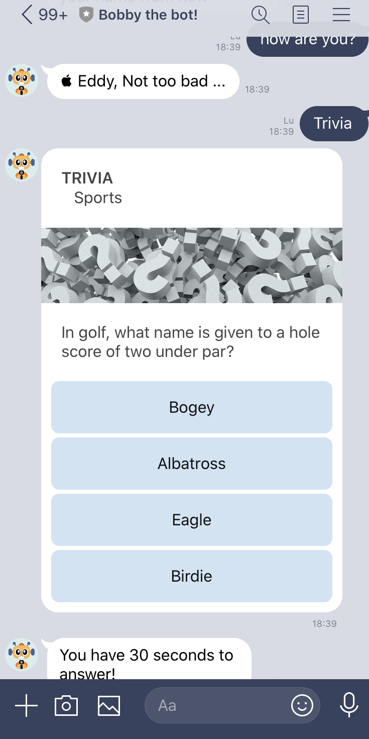 Bobby the bot! is a chatbot you can add on the Line messaging app.